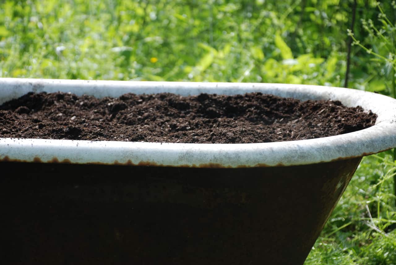 After you’ve layered rocks for drainage and filled in some of the extra space, a proper mix of soil is essential. Plants need air as well as water. Well draining soil helps create the right balance of the two. For containers, an appropriate soil mix involves a one third portion of garden soil, one third part compost, and a third part peat moss. Mix these three together well in a wheelbarrow. Fill your vintage tub to within a two inches of the rim with the soil mix.