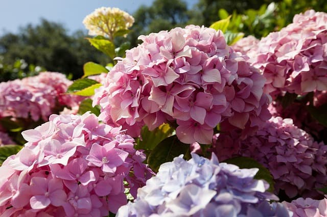 When people think of hydrangeas, they generally think of French or mophead hydrangeas (H. macrophylla). These plants produce rounded clusters of pink or blue blossoms. These are the plants you’ll find in decorative pots in the spring. They’re often sold as houseplants. Unfortunately, they’re hardy only to USDA plant hardiness zone 6 or 7. Acidic soils create blue flowers, while alkaline soils encourage pink blooms. Prune right after flowering.