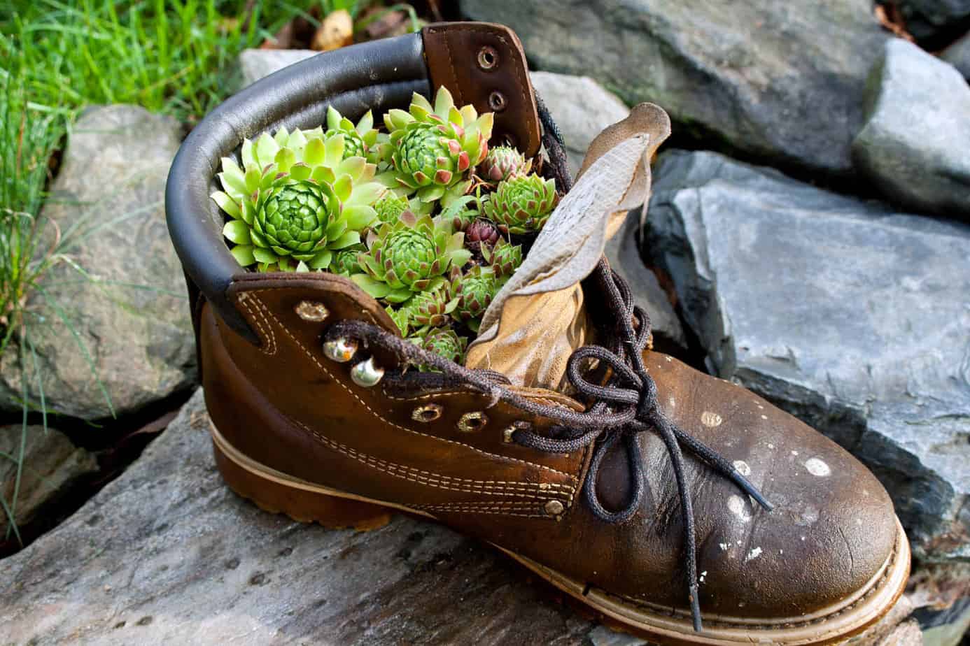 Old shoes and boots make short-lived but whimsical containers for small ornamentals.